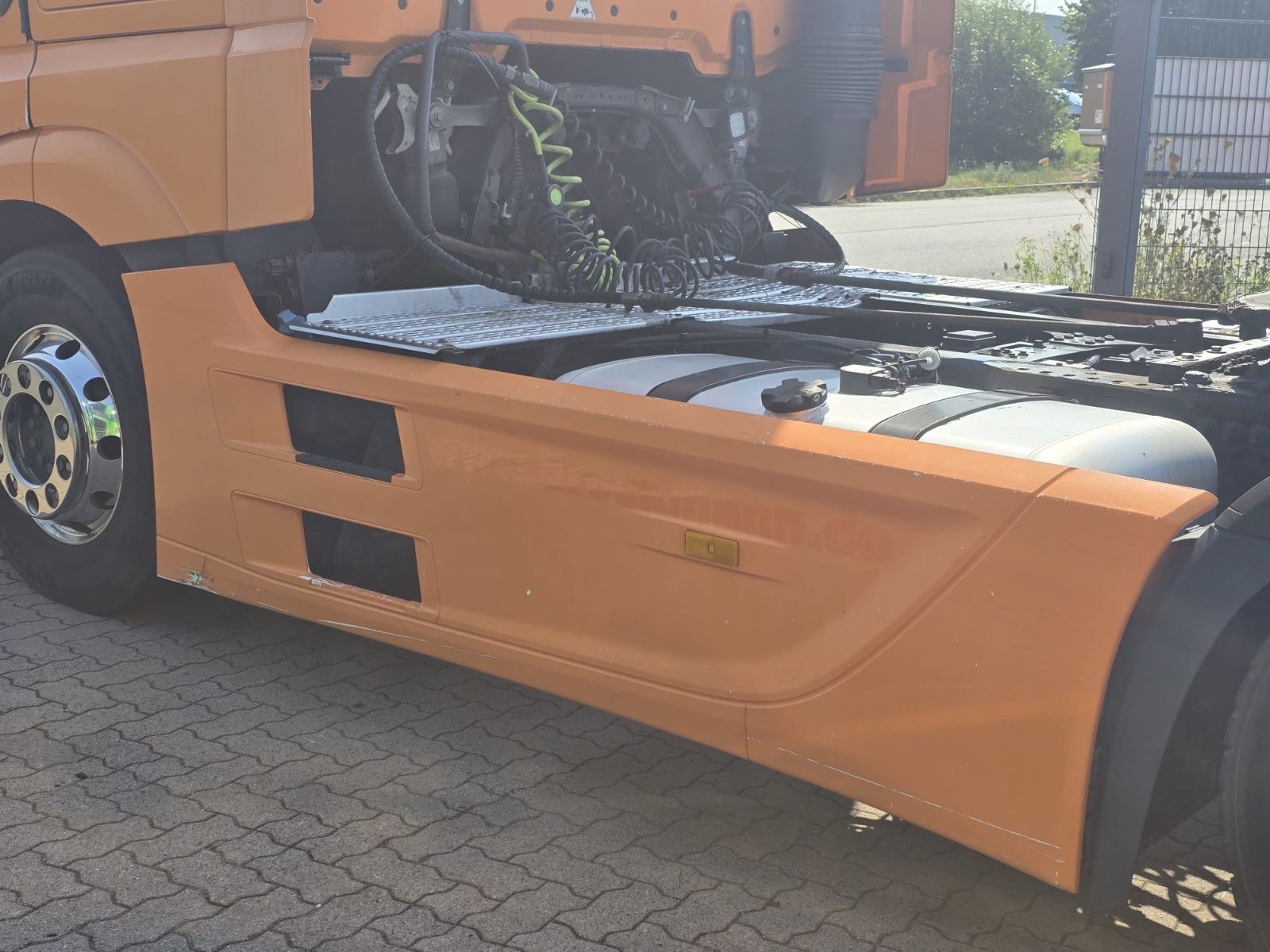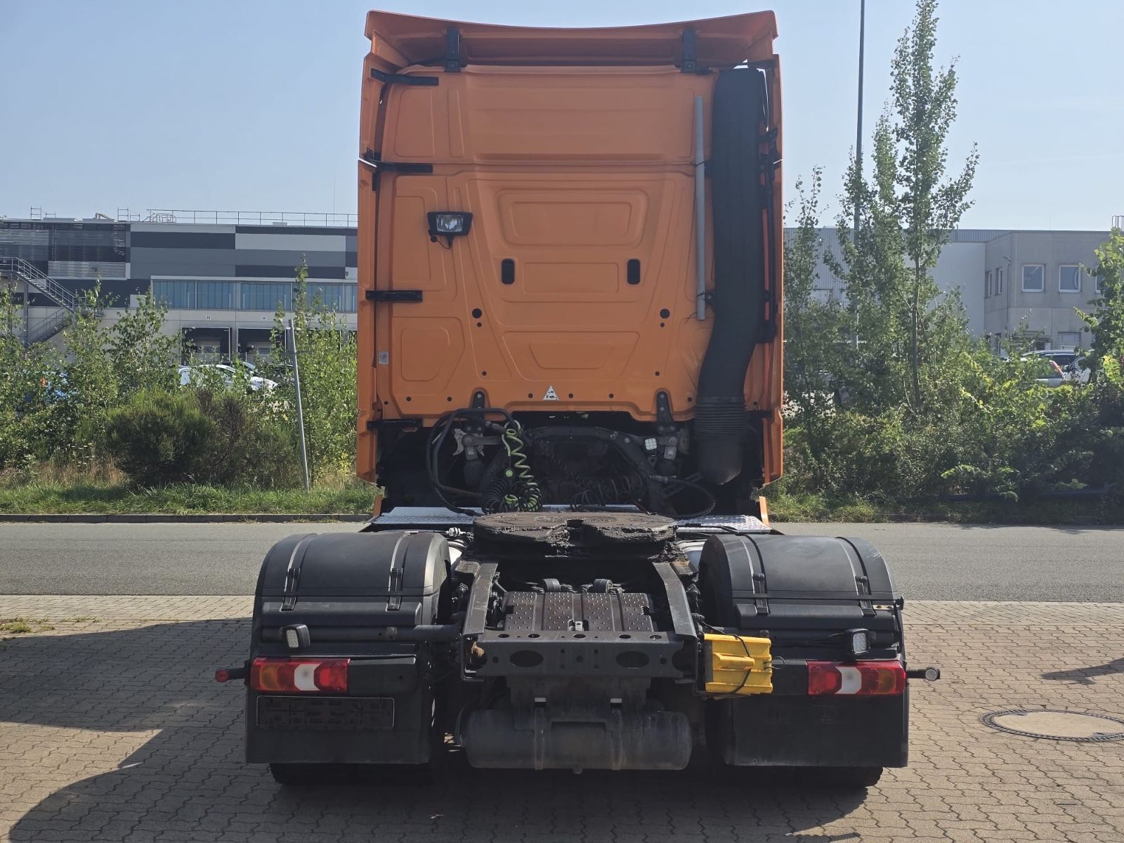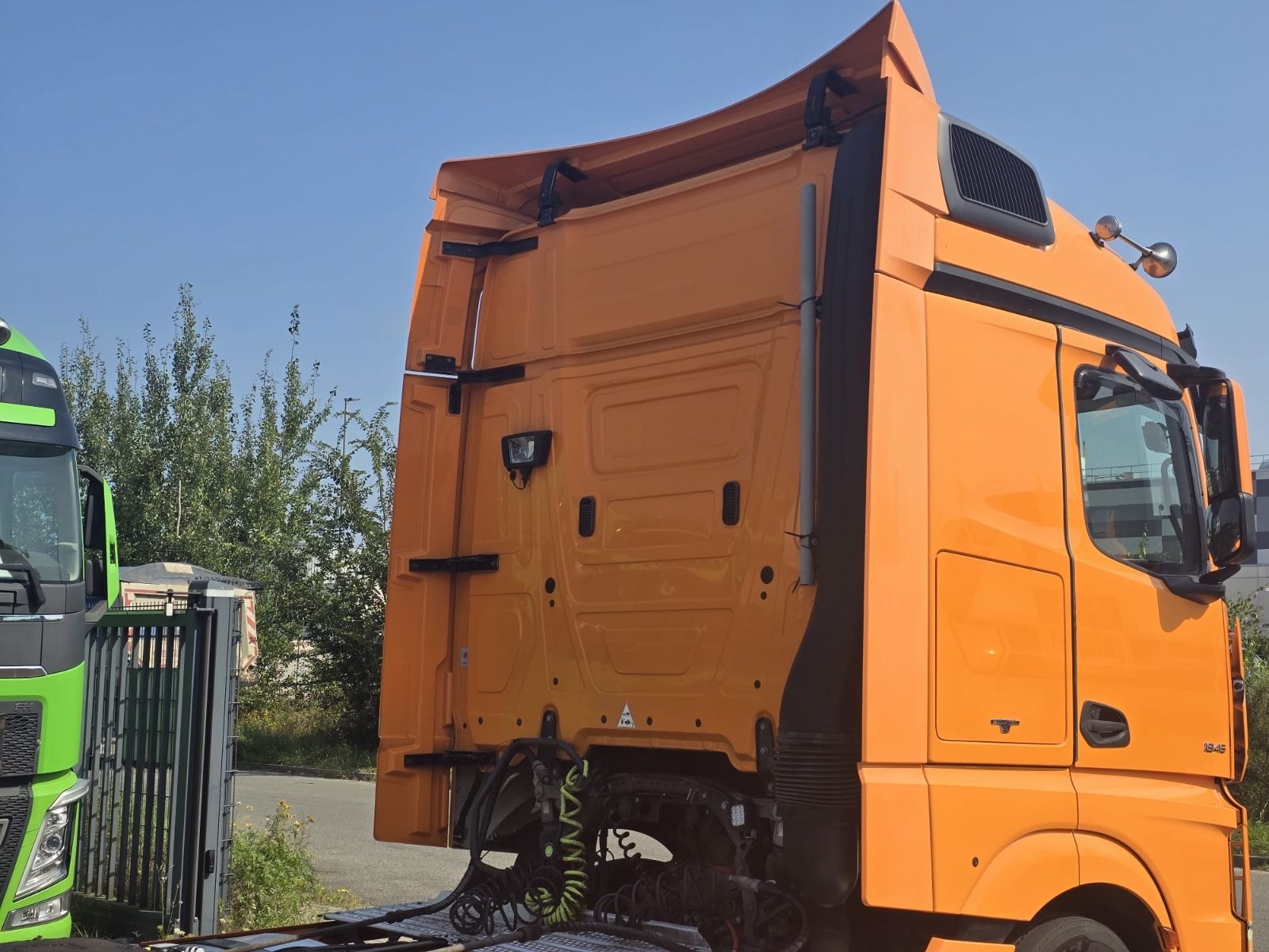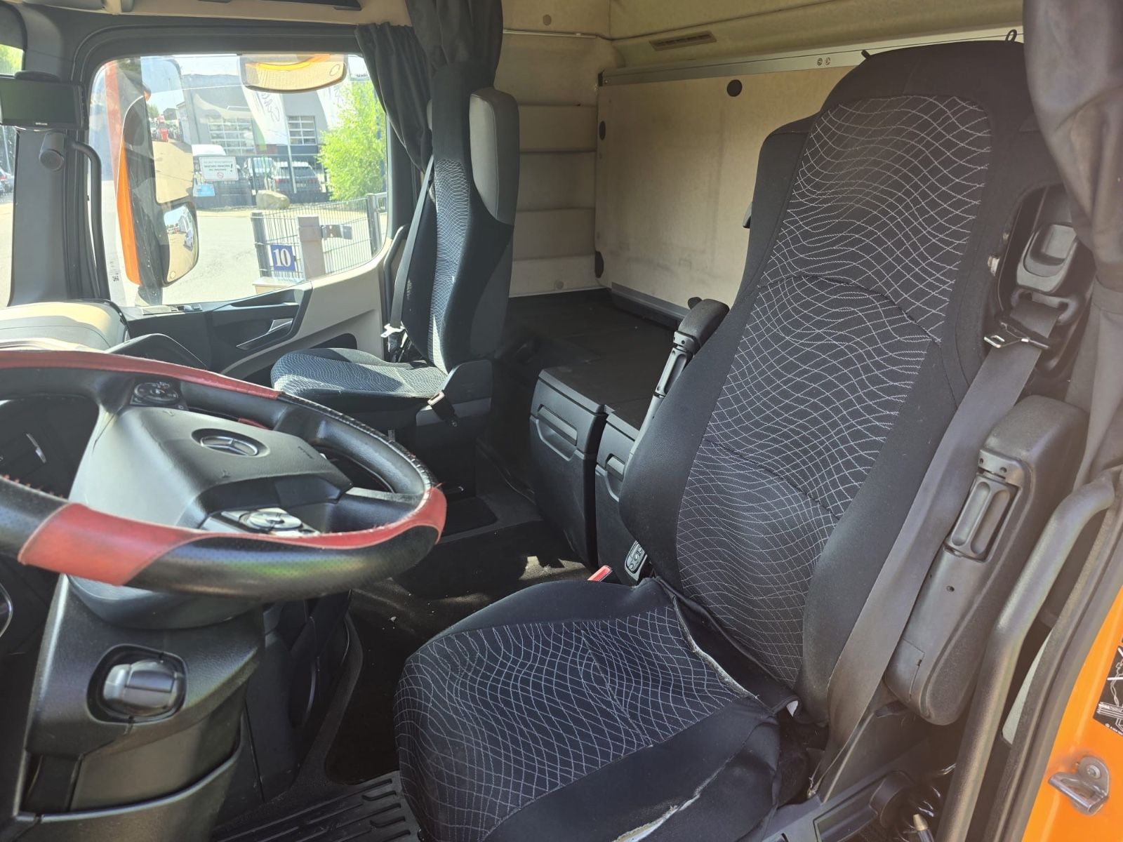 Mercedes-Benz Actros 1845 4×2 tractor unit, Euro 6, Stream Space driver’s cab with 1 sleeping area, frame spoiler, roof side spoilers, differential lock, ACC adaptive cruise control, lane-keeping assistant, collision warning, blind spot camera, auxiliary drive, slider floor hydraulic, air horns, tires 315/70 R 22.5, radio/CD, electric windows.